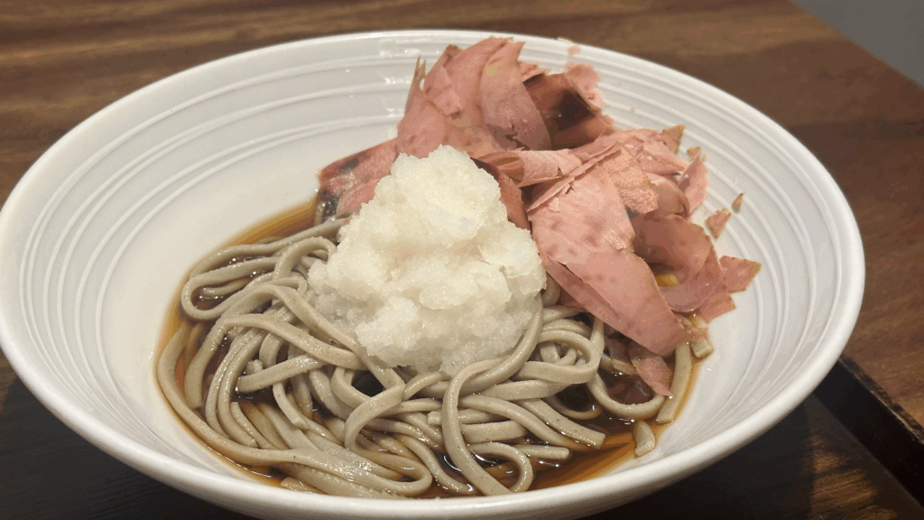 注文のたびに削る半生鰹節と、ピリッと爽やかな辛味大根の組み合わせ。十割そばの香りがぐっと引き立ちます。